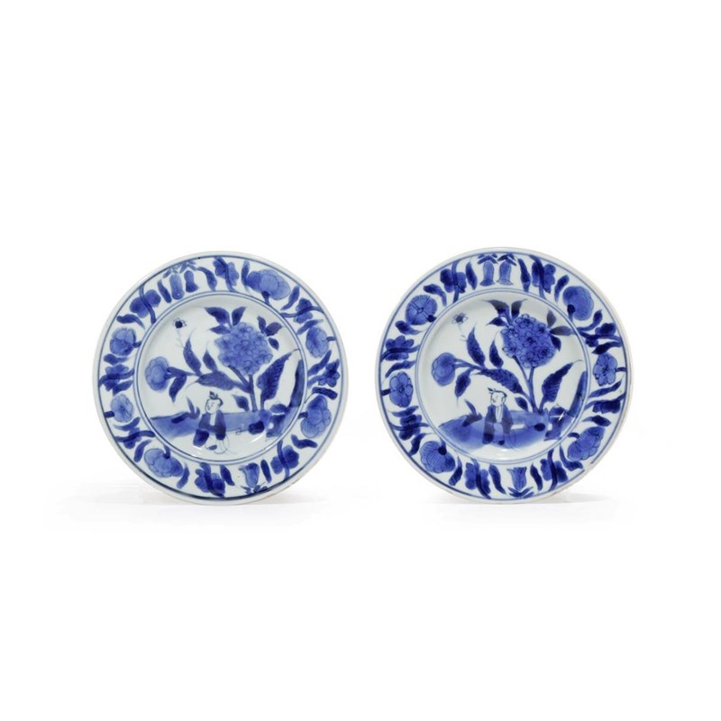 A PAIR OF CHINESE BLUE AND WHITE DISHES MID-17TH CENTURY Each painted with a boy sitting beneath...
