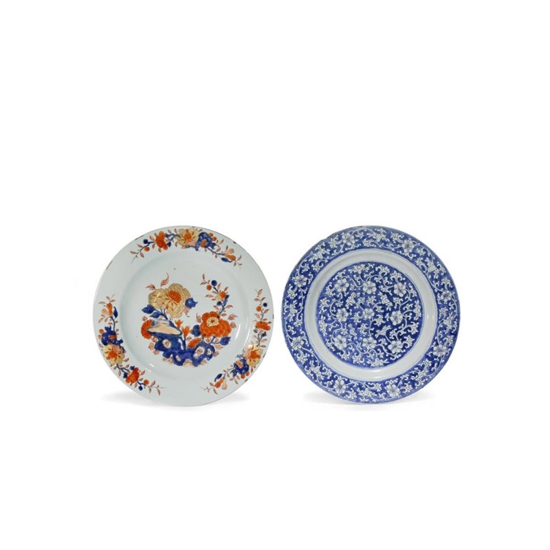 TWO LARGE CHINESE DISHES 18TH CENTURY One painted in the Imari palette with peony