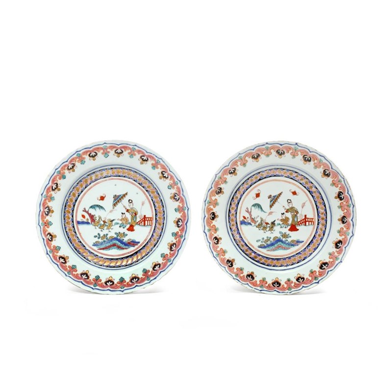 Painted with a central design after the Cornelius Pronk scene, La Dame au Parasol, the rims with scalloped foliate borders, 26.5cm. (2)