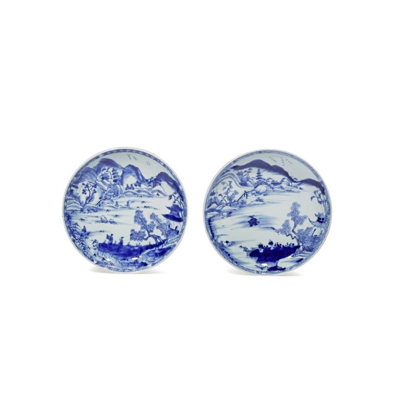 A PAIR OF CHINESE BLUE AND WHITE 'MASTER OF THE ROCKS' DISHES KANGXI 1662-1722 Painted with an...