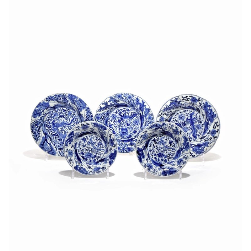 Comprising three larger and two saucer dishes, each painted to the well with a single phoenix flying amongst large peony flowers and foliage, the rim with bands of leafy trees with monkeys and flower sprays, 21.2cm and 16cm respectively. (5)