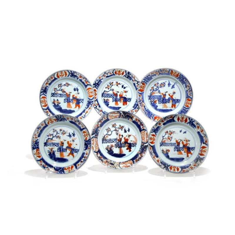 A SET OF SIX CHINESE IMARI PLATES EARLY 18TH CENTURY Each depicting a lady in a fenced garden