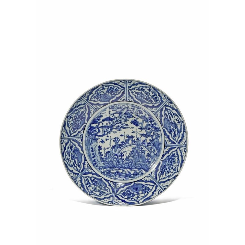 Painted with a circular panel depicting a mountain range, with figures in boats to the foreground and pine trees and a crane in flight above, the rim with panels depicting shaped cartouches of flower sprays, 45.5cm.