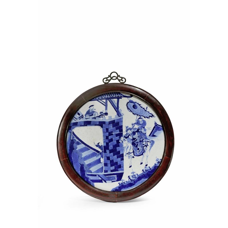 A CHINESE BLUE AND WHITE PORCELAIN CIRCULAR PLAQUE 19TH CENTURY Depicting Genghis Khan on...