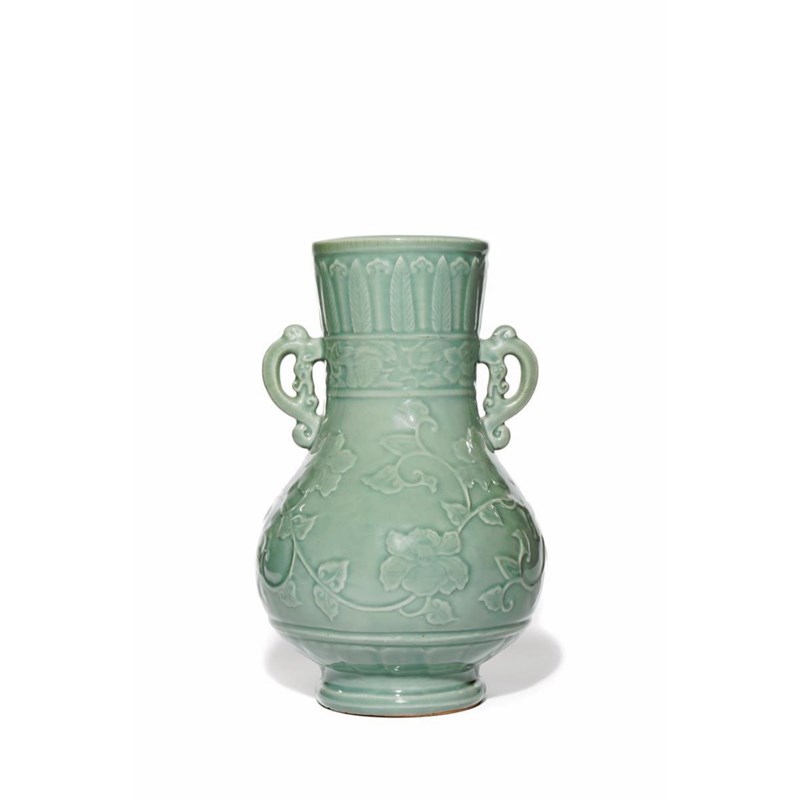A CHINESE CELADON VASE 19TH/20TH CENTURY The pear-shaped body moulded to the exterior with mallow...