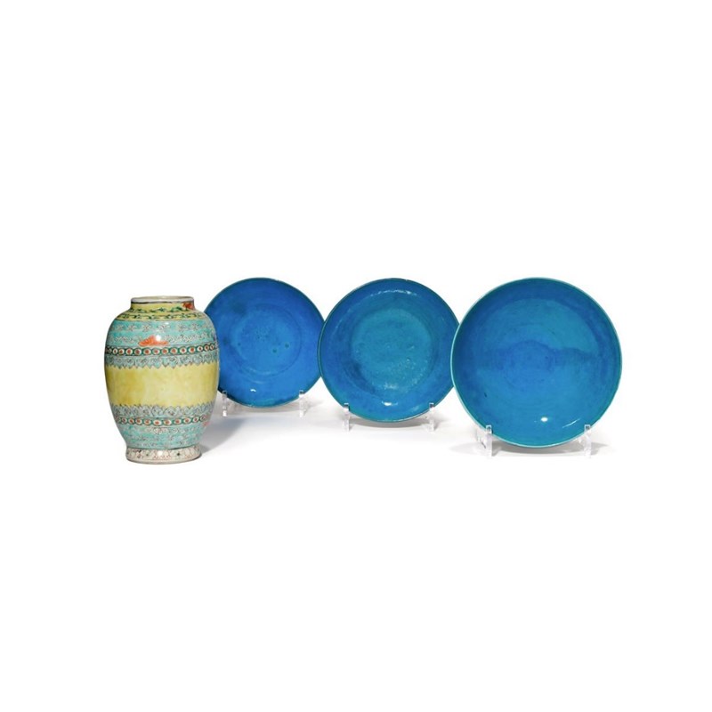 THREE CHINESE TURQUOISE GLAZED DISHES KANGXI 1662-1722 Of plain form