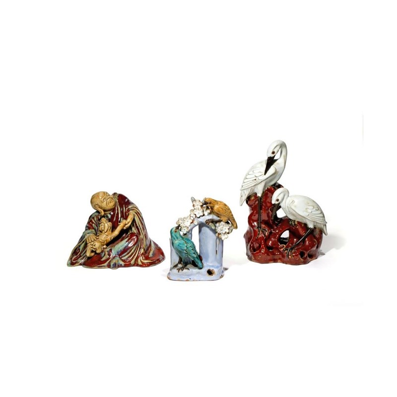 One a shiwan ware model of a luohan, seated in red flowing robes, a Buddhist lion dog grabbing his hooped earring, another a pair of parrots on a flowering prunus tree, the third with a pair of cranes perched on rockwork, the luohan with an inscription which reads luohan xi shi and a seal mark for Pan Yu Shu (d.1936), 30cm max. (3)