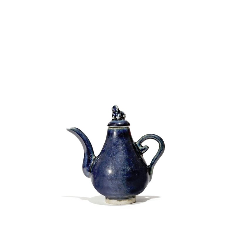 The pear-shaped body raised on a short flaring foot, the domed cover surmounted by a Buddhist lion dog, decorated all over with a deep blue glaze, 13cm. (2)
