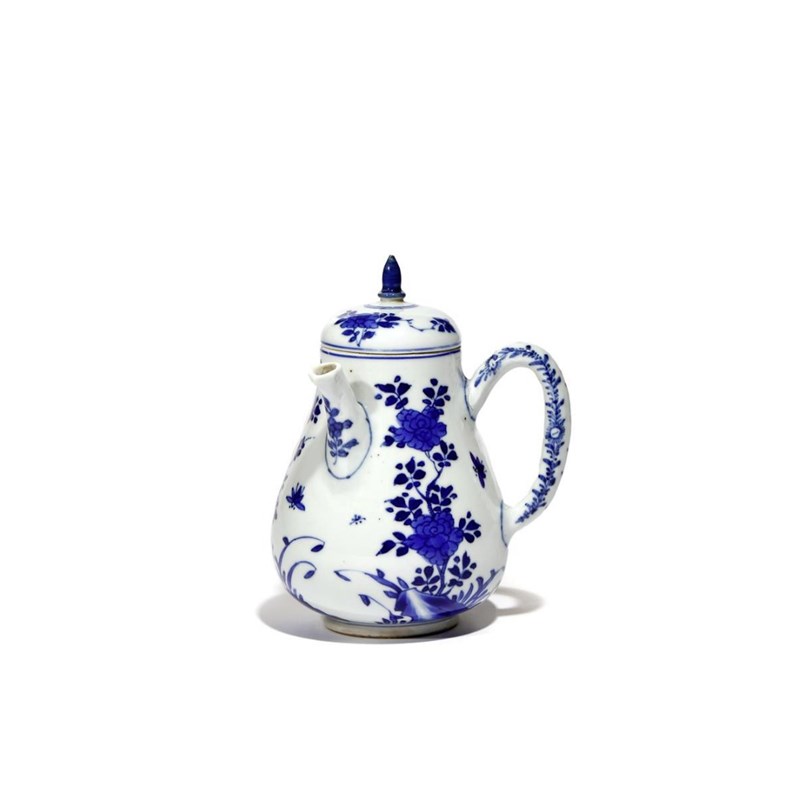 A CHINESE BLUE AND WHITE CHOCOLATE POT AND COVER KANGXI 1662-1722 The pear-shaped body painted...