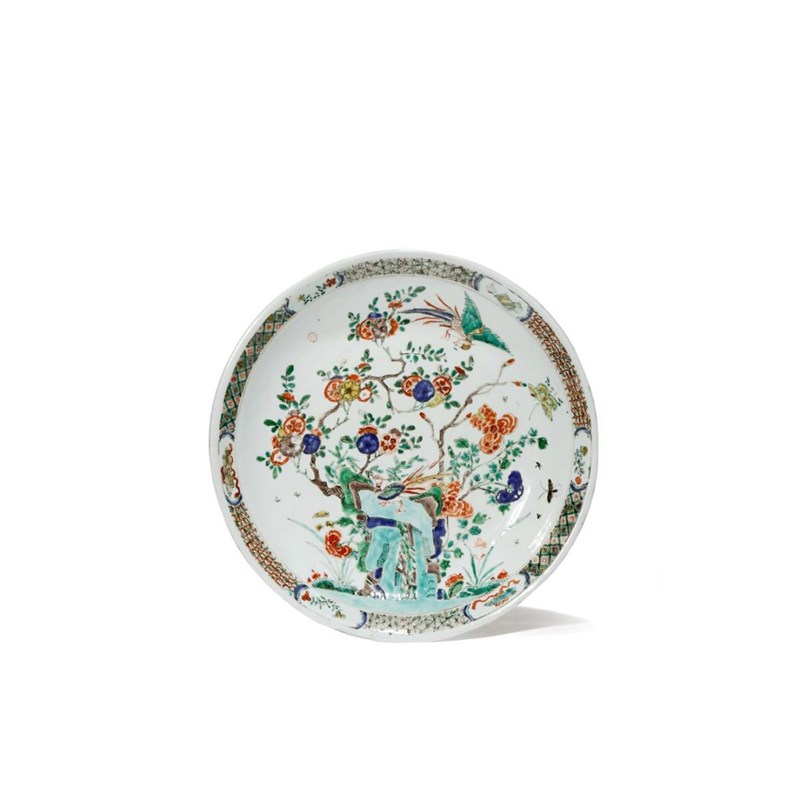 A CHINESE FAMILLE VERTE DISH KANGXI 1662-1722 Painted with a pheasant perched on rocks amongst...