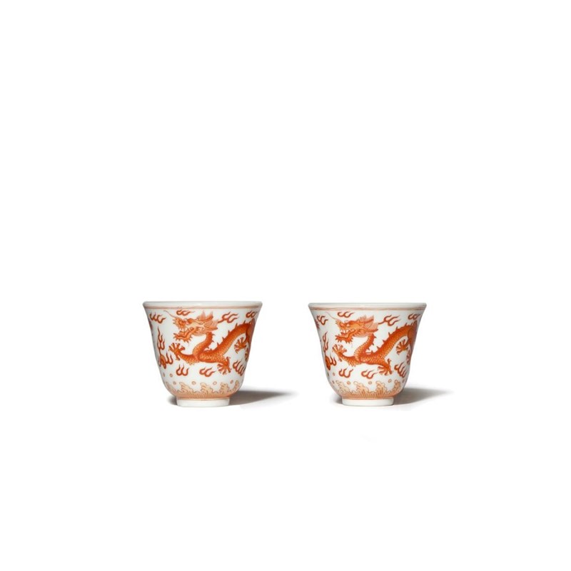 A PAIR OF CHINESE IRON-RED DRAGON WINE CUPS SIX CHARACTER GUANGXU MARKS BUT LATER Each painted...
