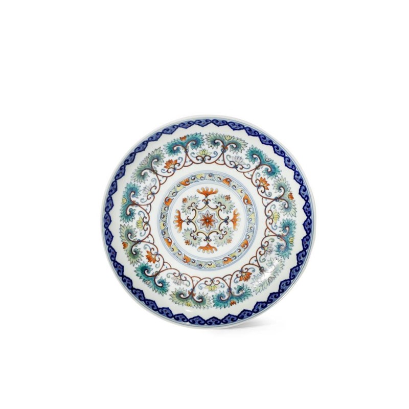 A CHINESE DOUCAI DISH PROBABLY LATE QING DYNASTY Painted with concentric bands of leafy foliate...