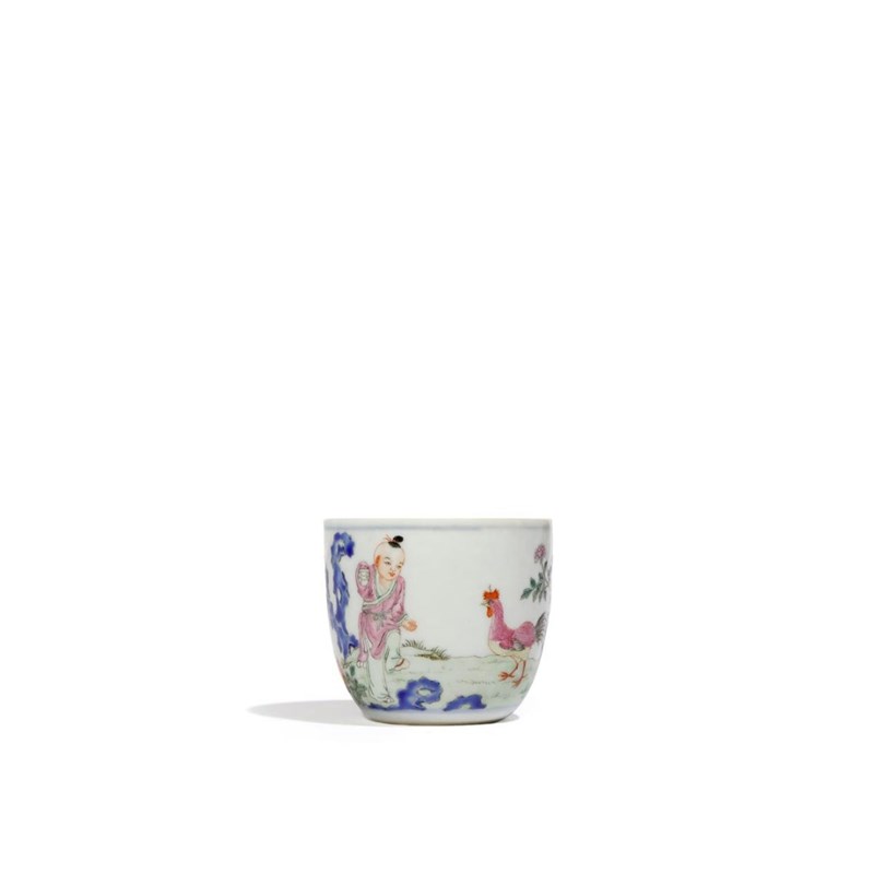 Finely painted to the exterior with a young boy and a cockerel with blue rockwork and peony, the reverse with a hen and her chicks below a poetic inscription, six character Qianlong seal mark, 8.1cm dia.