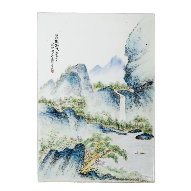 A CHINESE PORCELAIN RECTANGULAR PLAQUE 20TH CENTURY Painted with an extensive mountain landscape