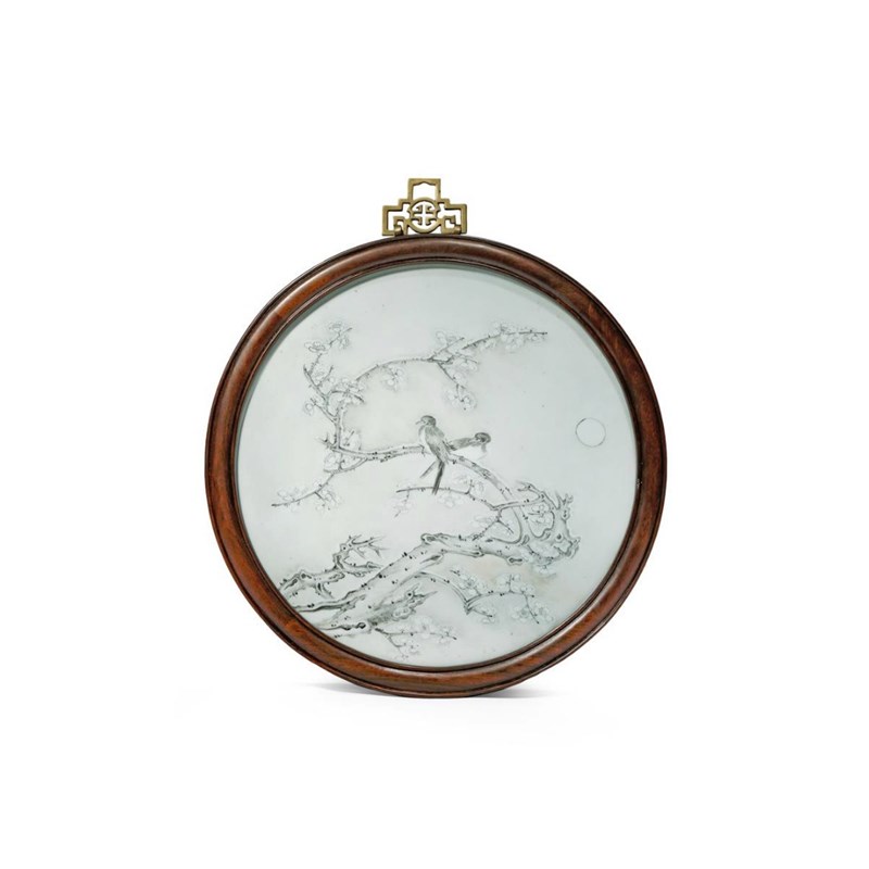 A CHINESE PORCELAIN CIRCULAR PANEL REPUBLIC PERIOD Painted with a pair of magpies perched in the...