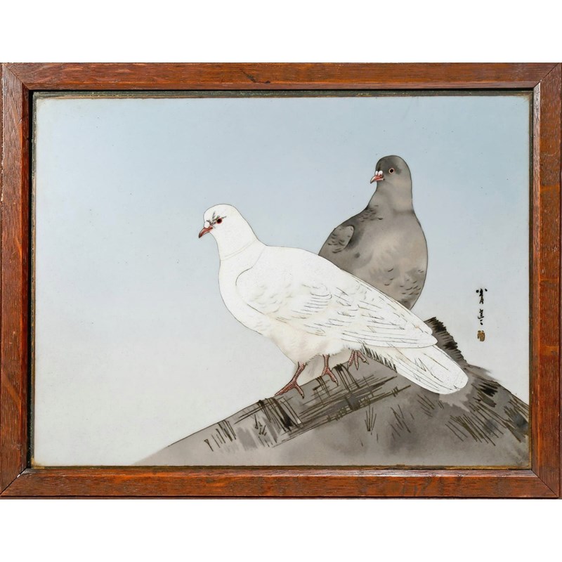 Depicting in musen (wireless) and shosen (partially wireless) enamels two doves perched on a thatched roof, signed Seitei and inscribed to the reverse Shippo Kaisha sei for the factory of Namilkawa Sosuke (1847-1910), after a design by Watanabe Seitei (1851-1918), framed, 28cm x 37.5cm.