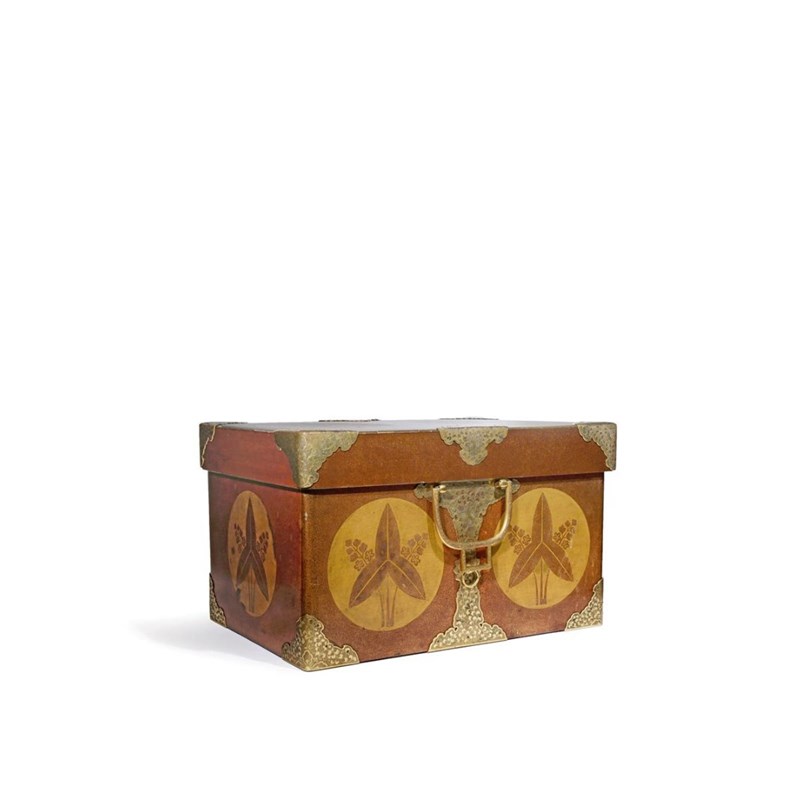 The body and cover decorated with large sagittaria trifolia gold lacquer mon for the Mizuno clan on a nashiji ground, the inside lined with gold paper, with elaborate gilt copper floral-etched fittings, 36.8cm x 45cm x 62cm. (2)