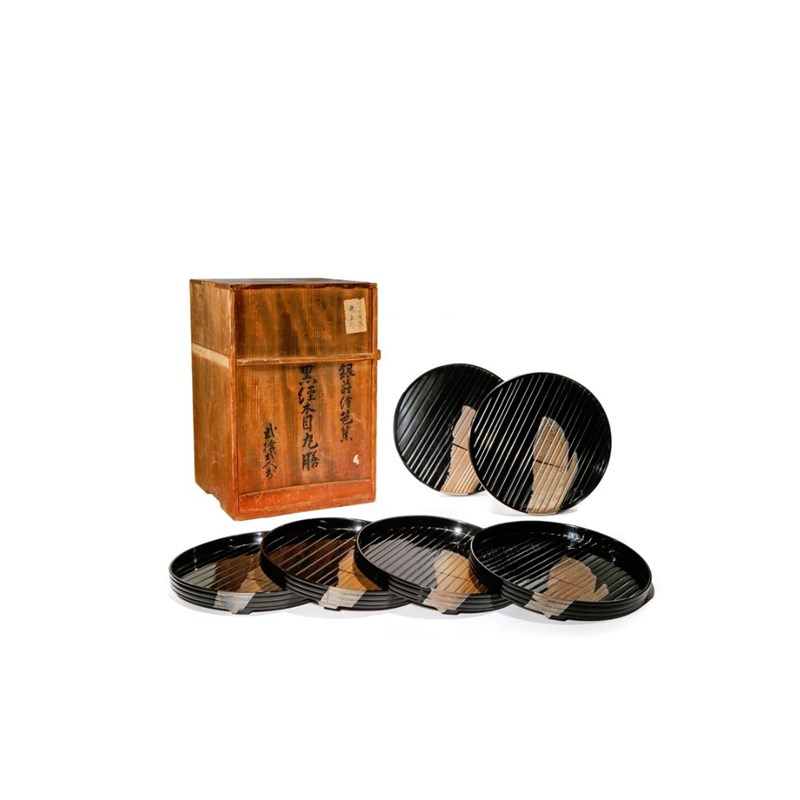 Each decorated with a gold banana leaf on a black rimmed background, together with a tomobako fitted storage box, 36cm. (8)