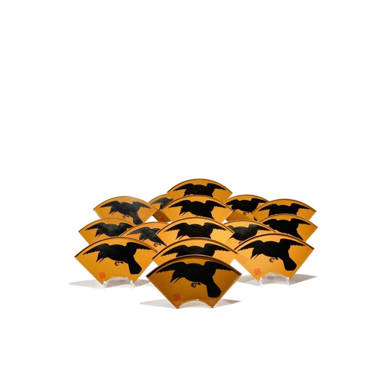 FIFTEEN JAPANESE FAN-SHAPED LACQUER TRAYS EARLY 19TH CENTURY Each decorated with a crow in flight...