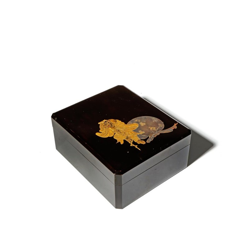 Of rectangular form with chamfered corners, with an inner tray decorated in gold with small birds in flight, the cover depicting Hotei with an enormous sack, 19.5cm. (3)