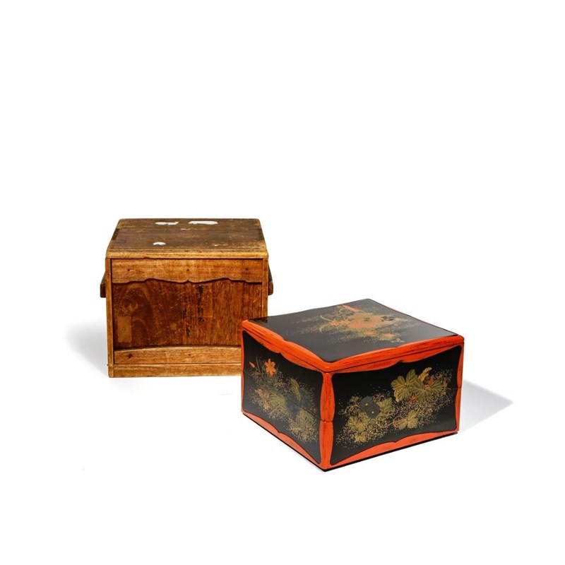 Delicately decorated in gold to the cover with a basket of flowering peony, lily, rose and magnolia, the sides with further sprays of flowers, all within red lacquer borders, 23cm. (3)