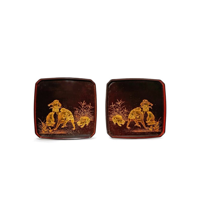 A PAIR OF JAPANESE BLACK AND GOLD LACQUER TRAYS
