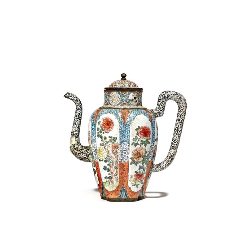 十八世紀 銅胎畫琺瑯開光富貴牡丹茶壺