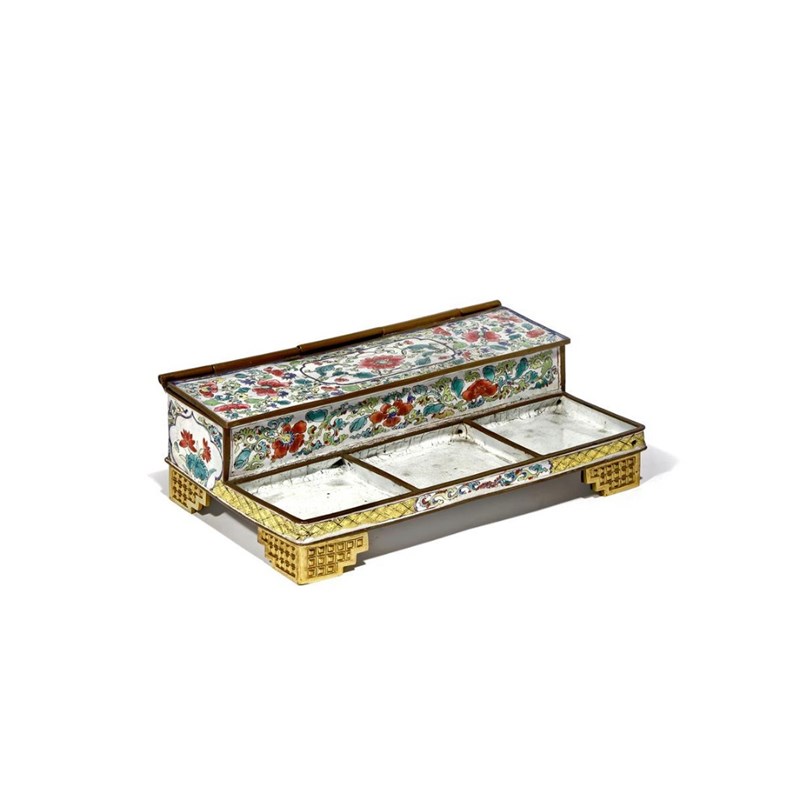 *A CHINESE CANTON ENAMEL FAMILLE ROSE DESK SET QIANLONG 1736-95 With a hinged compartment for...