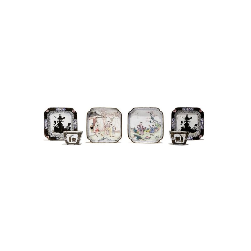 清乾隆 銅胎畫琺瑯人物故事紋及博古紋方碟及小杯 一組六件