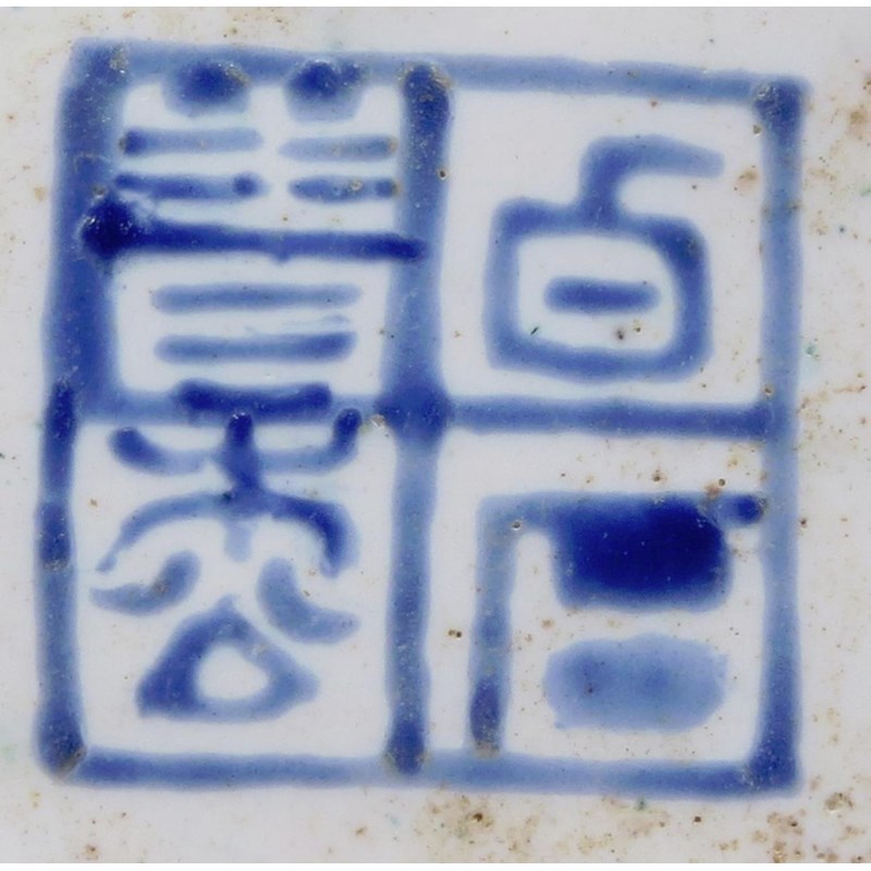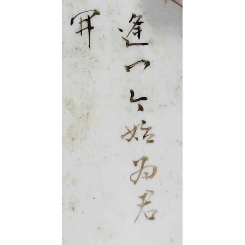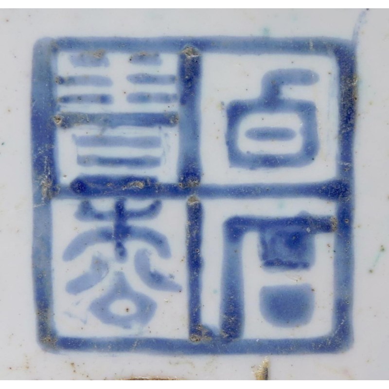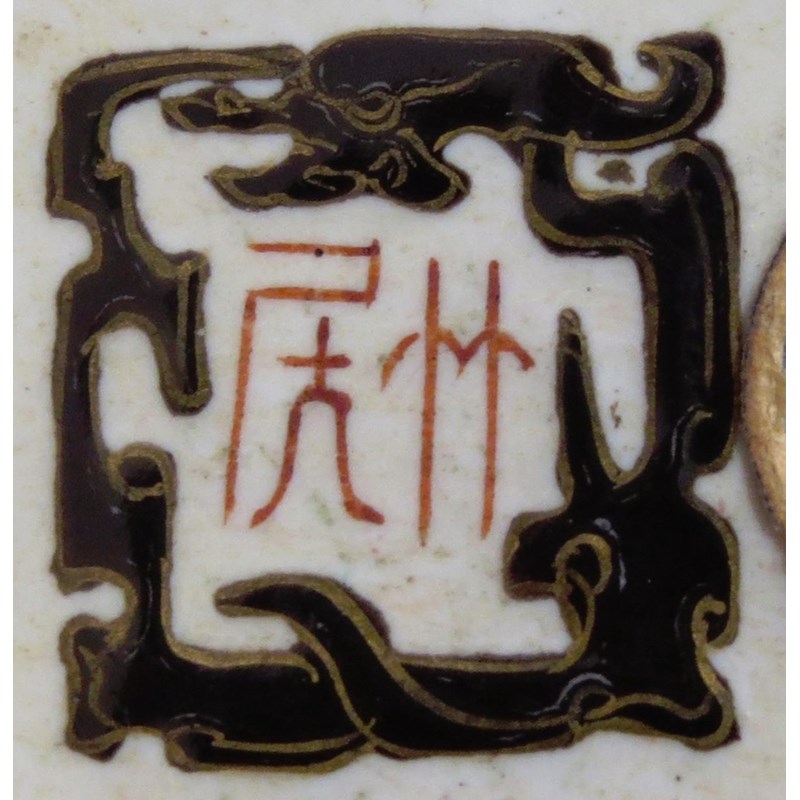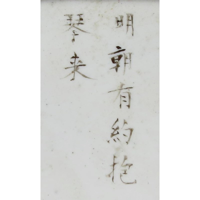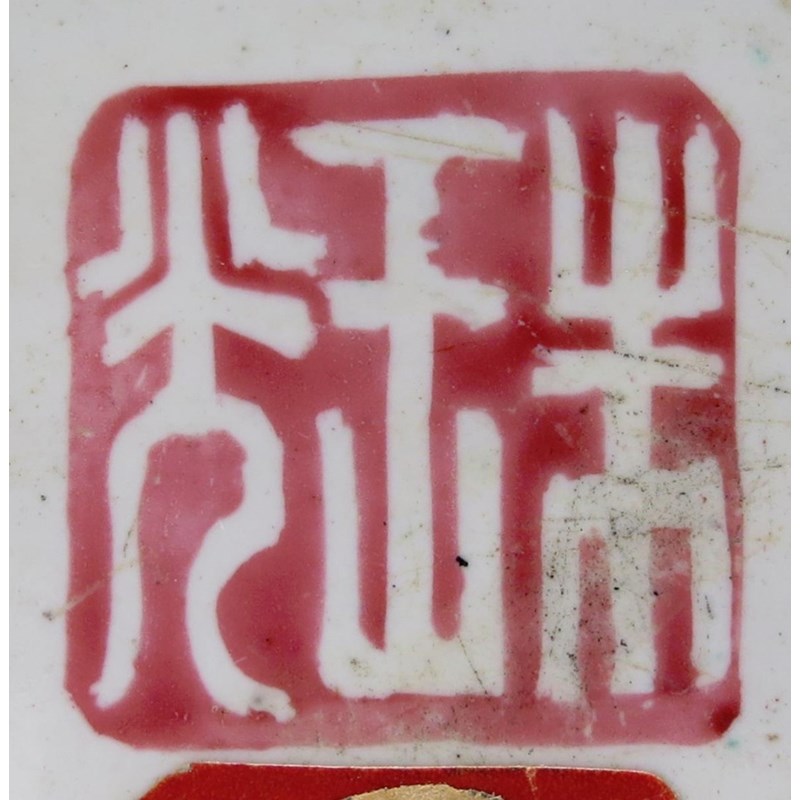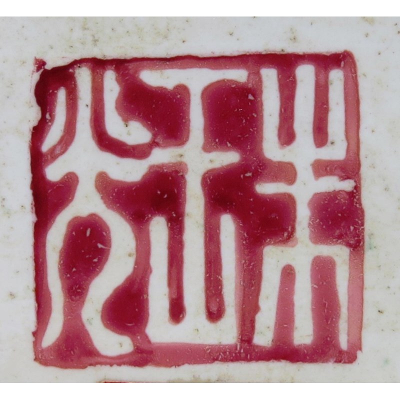With grisaille and gilt decoration, depicting vases and auspicious objects, together with a pair of famille rose square dishes, depicting figures and a poem, each with a two character mark which reads rui guang (auspicious light), 10cm. (6)