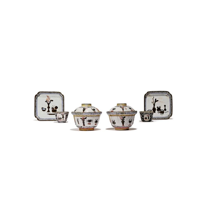 清乾隆 銅胎畫琺瑯博古紋蓋碗、方碟及小盃 一組六件
