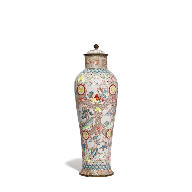 Painted with quatrefoil panels, variously decorated with European figures, mountain landscapes, birds, a deer and a tiger, divided by flowerhead roundels and reserved on a taupe ground with scrolling peony blooms, the neck with prunus on a cracked-ice ground, the cover associated, 30.4cm. (2)