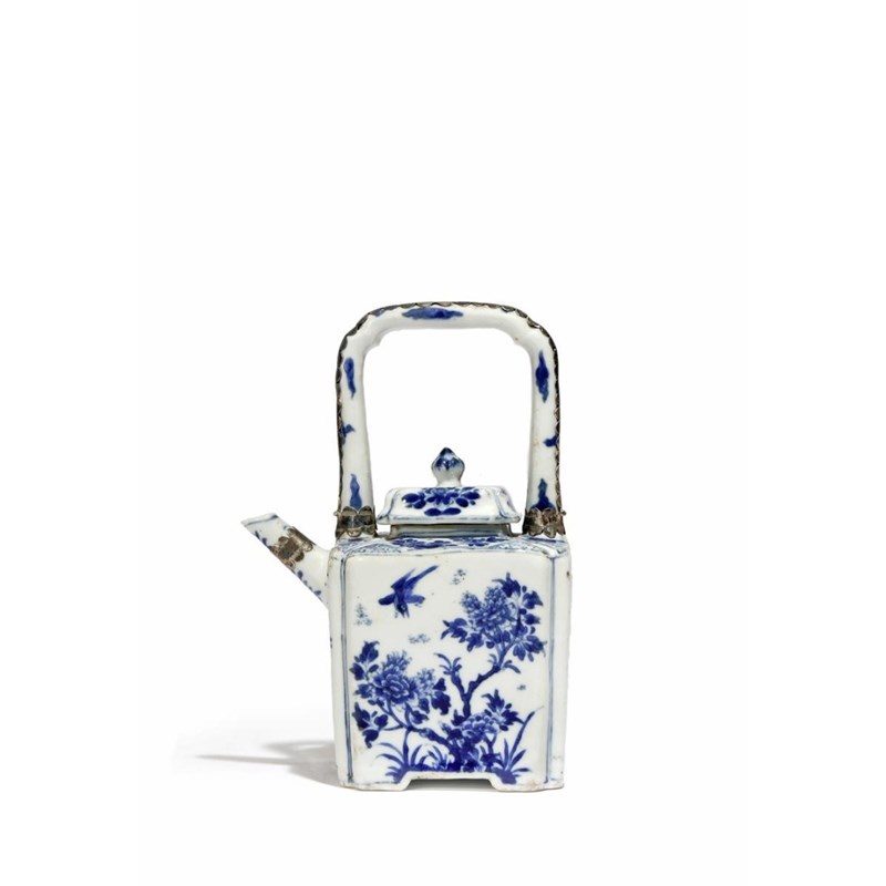 A CHINESE BLUE AND WHITE WINE POT AND COVER KANGXI 1662-1722 The tapering square-section body...