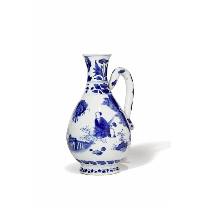 A CHINESE BLUE AND WHITE EWER C.1640 The pear-shaped body painted with scholars in a rocky fenced...