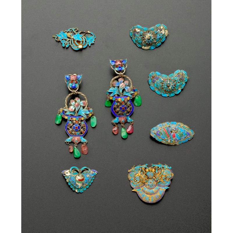 清 點翠飾品及畫琺瑯耳飾 一組八件