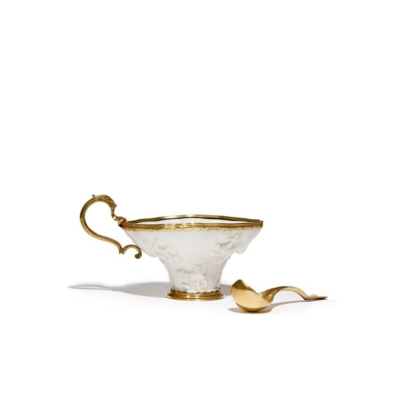 A RARE CHINESE BLANC DE CHINE GILT COPPER-MOUNTED LIBATION CUP LATE 17TH CENTURY The porcelain...
