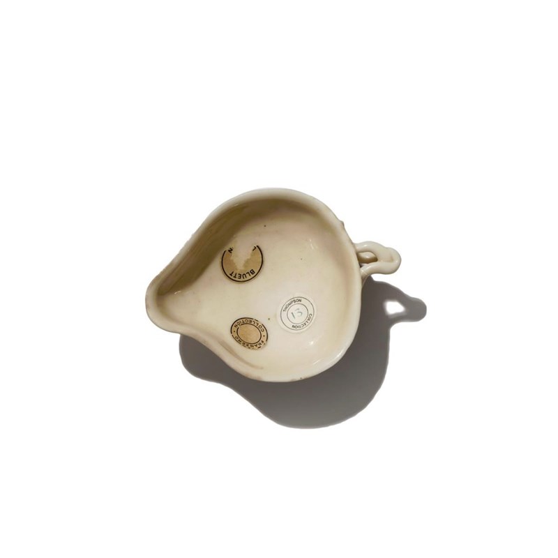 Formed as a lychee fruit, the curling stem forming the handle, with a smaller fruit and leaves extending down the body, paper labels for Bluett London, the Franzero Collection and the Thompson Collection, no.13, 9.5cm.