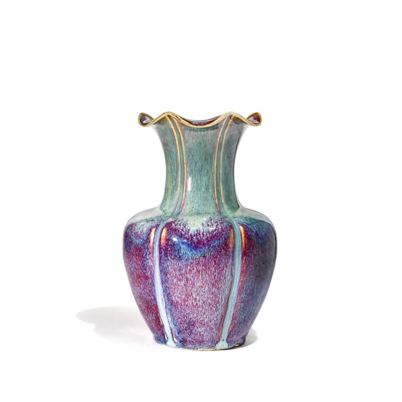 A CHINESE FLAMBE GLAZED VASE QING DYNASTY The lobed ovoid body rising to a flaring fluted neckrim