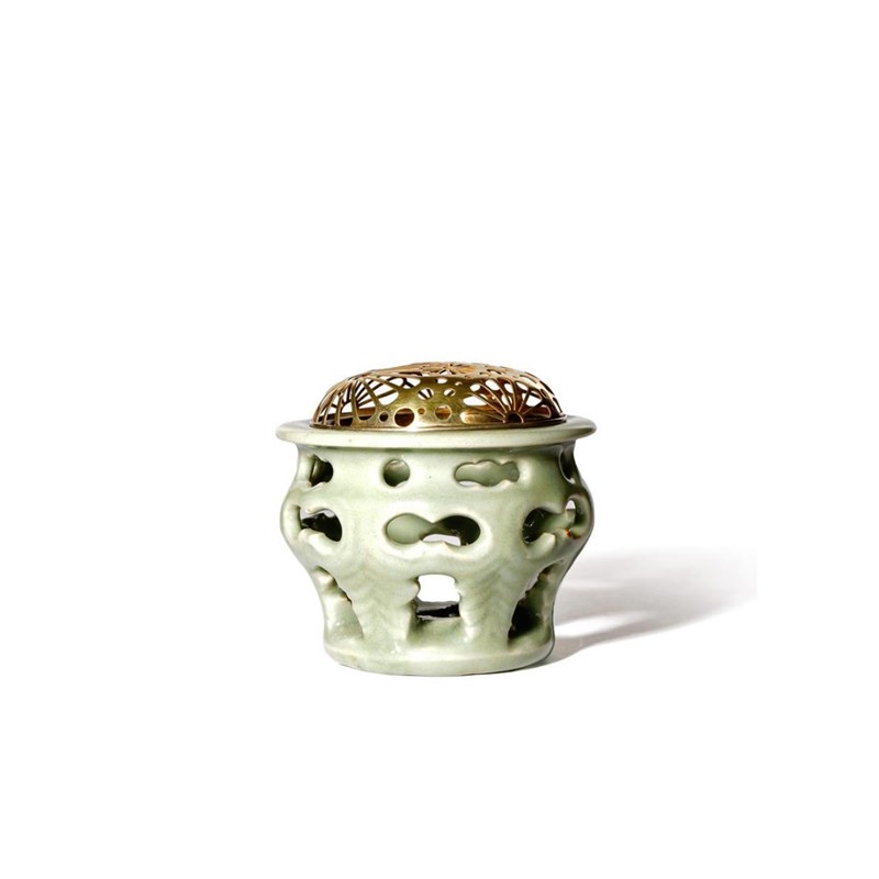 Of baluster form on a ring foot, with circular and ingot-shaped apertures, faintly carved with chevrons, together with a Japanese gilt metal cover reticulated with chrysanthemum, a fitted wood box,10.4cm. (4)