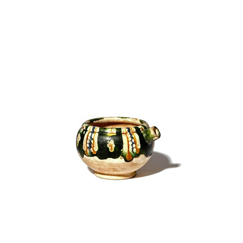 The ovoid body with a short circular spout, decorated in green, blue, ochre and cream glazes with flowerheads divided by vertical bands, the lower body unglazed, 13cm.