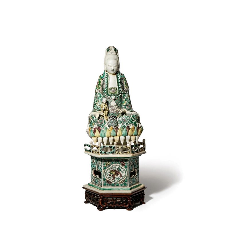 Seated wearing draped foliate robes, a small child on her right knee, the separate famille verte double-lotus base on a tall hexagonal plinth, painted with foliate and cracked-ice designs, all raised on a hexagonal hardwood stand, a paper label for L. Wannieck, Paris, the figure 39.7cm overall. (3)