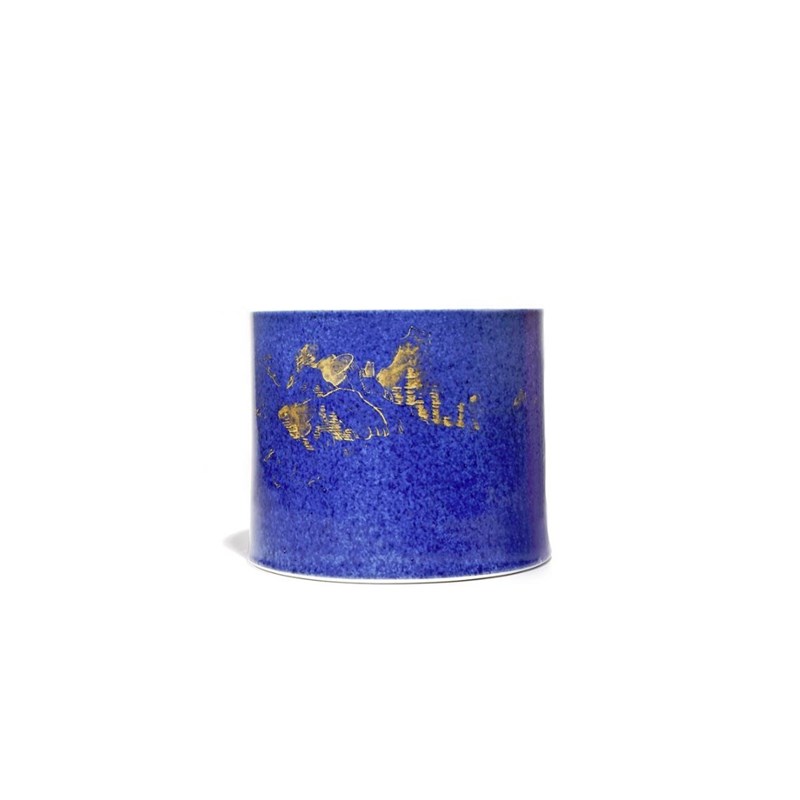 The cylindrical body decorated in gilt with an extensive mountain landscape, reserved on a mottled blue ground, the interior glazed white, the base with a paper label for Bluett London, 17.7cm dia.