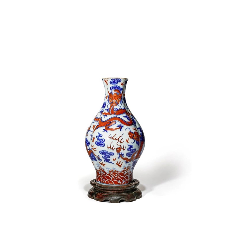 Painted in underglaze blue and overglaze red enamels with three five-clawed dragons with flaming pearls of wisdom amongst clouds, all above crashing waves, raised on a fitted hardwood stand, 30cm. (2)