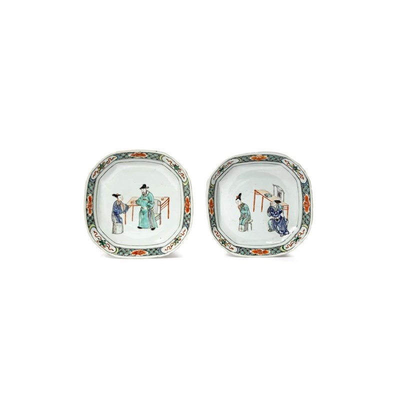 A PAIR OF CHINESE OCTAGONAL FAMILLE VERTE DISHES KANGXI 1662-1722 One depicting a gentleman...