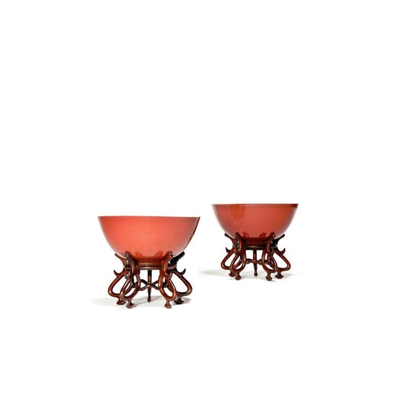 Each decorated with a sang de boeuf glaze, the interior glazed white, raised on five-legged hardwood stands, 14.4cm. (4)