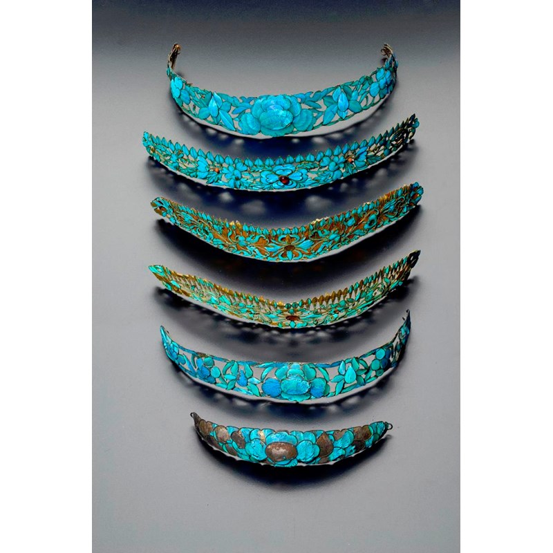 SIX CHINESE GILT METAL AND KINGFISHER FEATHER HEAD BANDS