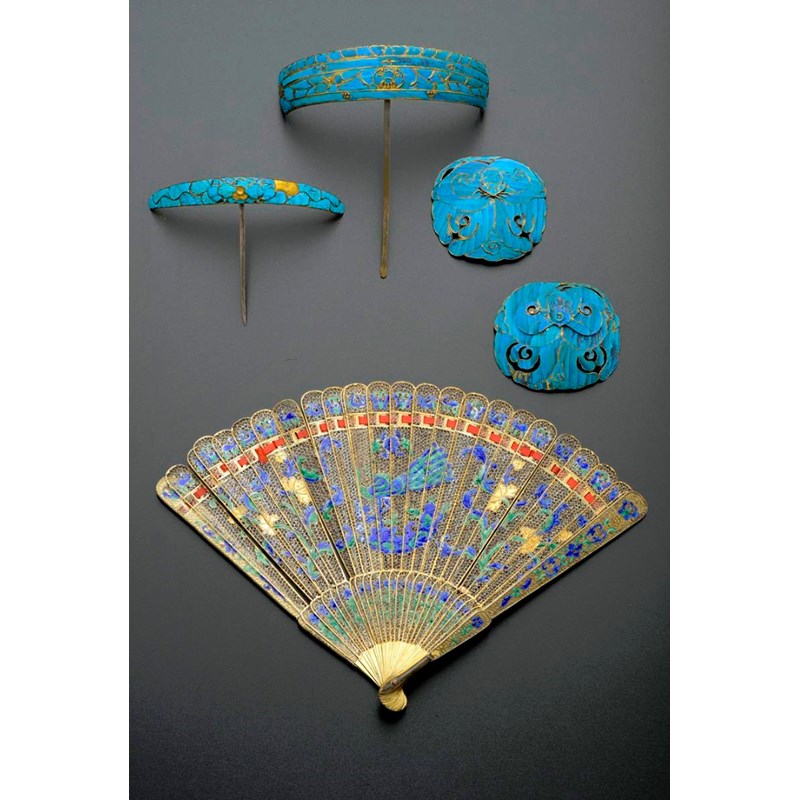 清 點翠頭飾及畫琺瑯鳳戲牡丹折扇 一組五件
