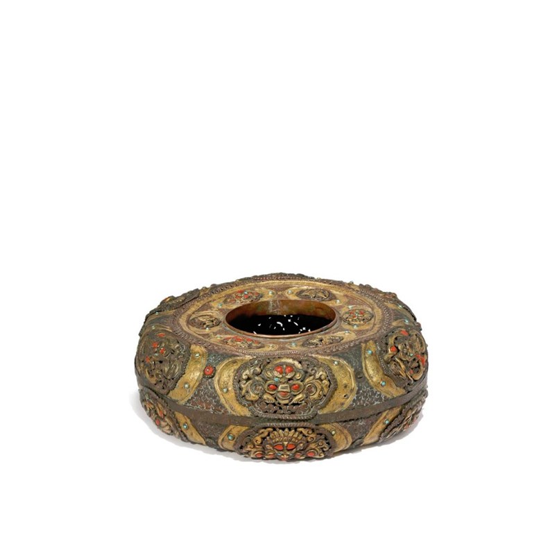 A TIBETAN CIRCULAR GILT METAL BOX AND COVER 19TH CENTURY The compressed circular body with a...