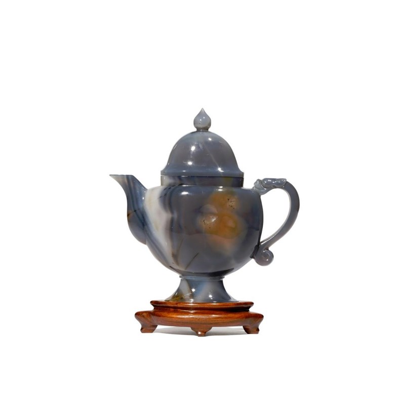 A CHINESE AGATE EWER AND COVER LATE QING DYNASTY The flattened ovoid body raised on a flaring foot
