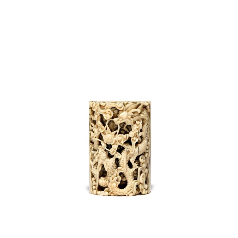 The domed top depicting two scaly dragons contesting a flaming pearl of wisdom amongst clouds, all above crashing waves, an incised seal mark to the base which reads San dai hu fu xuan, 7.8cm.